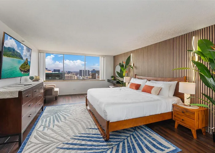 Located within a 5-minute drive of Magic Island, the 2-room Hawaiian Monarch Penthouse 401 By Hawaii Ocean Club Apartment Honolulu is around a 25-minute walk from a top family-friendly place like Honolulu Zoo. Offering access to a year-round outdoor swimming pool, this apartment is at a moderate distance from Upscale shopping.